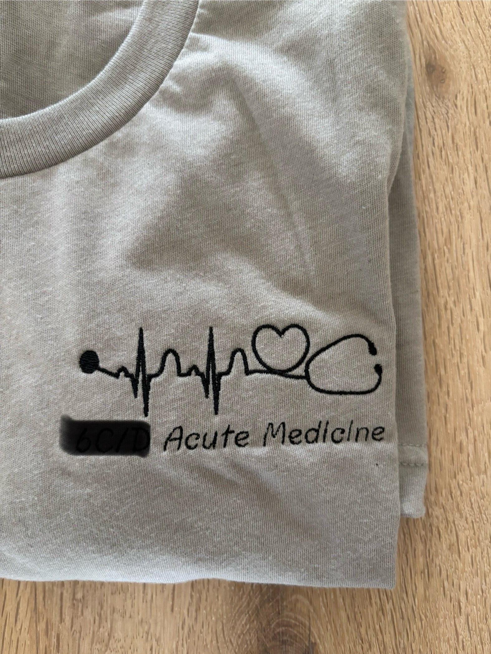 A unique heartbeat stethoscope design placed on the upper left corner, personalized with your name or floor, adds a meaningful and stylish touch. Available in both short sleeve and long sleeve styles, this tee is a comfortable way to showcase your passion for healthcare.