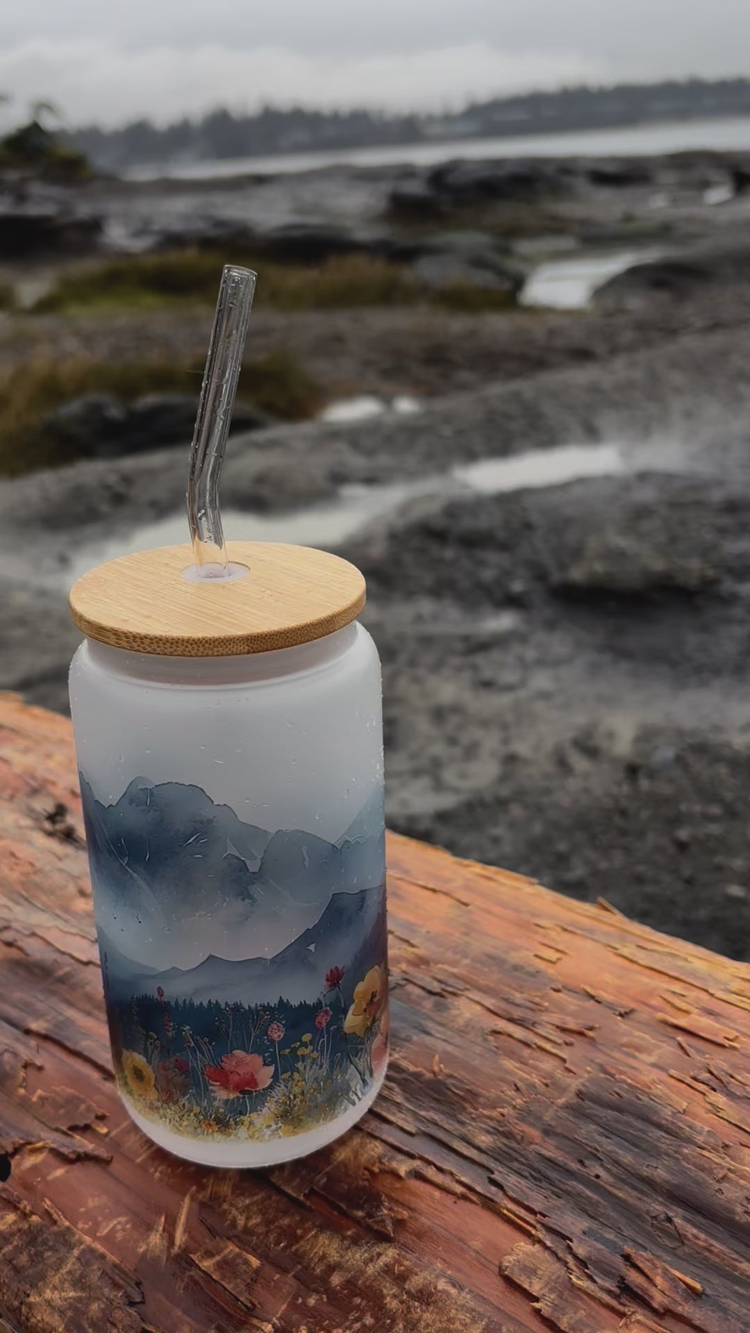 Sip in style with our Mountain Wildflower Frosted Glass, perfect for your favourite iced coffee, tea, or refreshing beverage. This 16 oz glass features a stunning mountain scene adorned with delicate wildflowers, bringing a touch of nature’s beauty to your everyday routine. The frosted finish adds a soft, elegant look, while the included bamboo lid and reusable glass straw make it both stylish and eco-friendly.